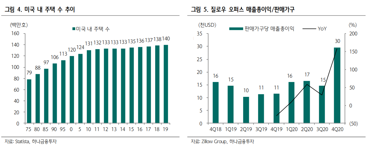 2) 부동산 시장의 경쟁 심화로 미국 내 10.6만개의 부동산 중개업체와 5만개의 모기지 사업자가 존재하며 질로우의 경우 현재까지 미국 내 주택거래의 0.1%, 모기지 대출의 0.1% 미만을 차지하고 있는 점과 코로나 19로 인해 직접 매물 확인이 어려워 촉발된 언택트 수요와 재택근무 증가에 따른 단독주택 수요에 따른 거래량 증가도 간과할 수 없다.